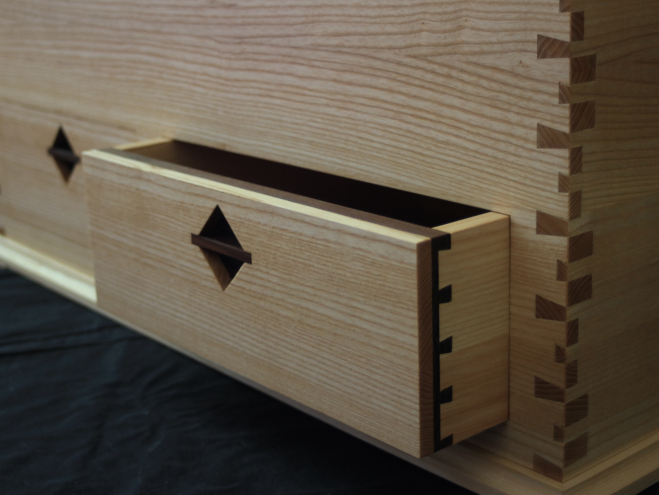 Die Eckverbindungen sind von Hand gearbeitet, eine Variante der klassischen Zinkung, hier eine schräge Fingerzinkung.